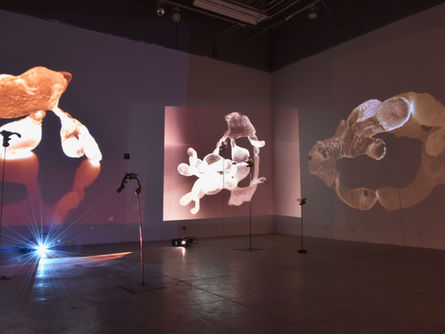 People looked up to the heavens to understand themselves and their place in the universe since time immemorial. Ancient people relied on meticulous observation of light and shadows to determine relationships between the Earth, Moon, and Sun with naked eye. They created stories and sought protection from their worst fears and instincts. Today we use new technologies and similar principles to see trillions of light years away into the cosmos. We look at patterns, light warps, and deep shadows to echolocated ourselves. Thermal Cavity applies similar observation techniques of light and shadows to make the viewers the subject of their own observation. It asks us to notice our own experience in the crosslight of multiple projectors placed around the perimeter of the exhibition space where multiple moving shadows suggest a fluid, non-singular nature of being at different scales simultaneously.The installation consists of projected images of cast glass sculptures, bronze sculptures, and small photographs. Visitors enter armed with small flashlights to discover the artworks up close. The hum and warmth of projectors immerse visitors into underwater, vibrating, or womb-like, atmosphere. The installation questions the distinction between molecular and interstellar scales of self-awareness and the world we inhabit.